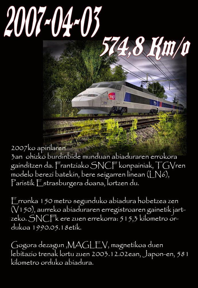 Gaur, apirilaren 3an, fitxa berri bat gehituko diogu gure munduko trenbidearen historiari. 2007.04.03an, Frantziako lurretan gertatu zen tren abiaduraren erregistro historikoa. Bertan, tren konbentzional batentzat, hau da, itsaspenean dabilena,   574,8 kilometro orduko abiadura harrigarria lortu zen.